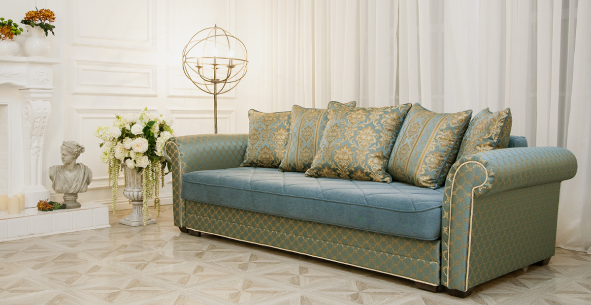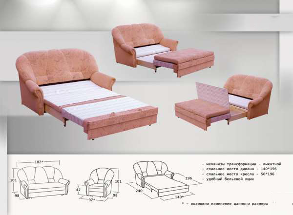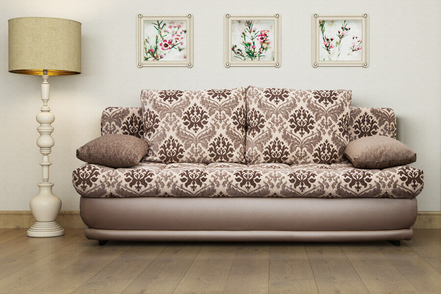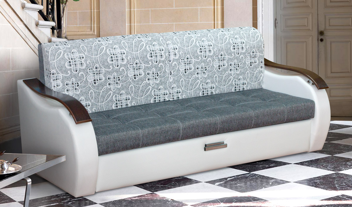 Der Vorteil dieses Modells ist eine große Auswahl an Polsterungsoptionen. Mit Geschmack wird die gewählte Kombination verschiedener Muster und Texturen einen unauslöschlichen Eindruck hinterlassen und das Interieur perfekt ergänzen. Elegante Stifte und strenges Pillow-Design werden die Fans der Klassiker ansprechen. Eingebaute Schubladen für Wäsche sparen Platz.Der Faltmechanismus "Evroknizhka" ist einfach zu bedienen und bildet eine glatte Schlaffläche ohne Gelenke.