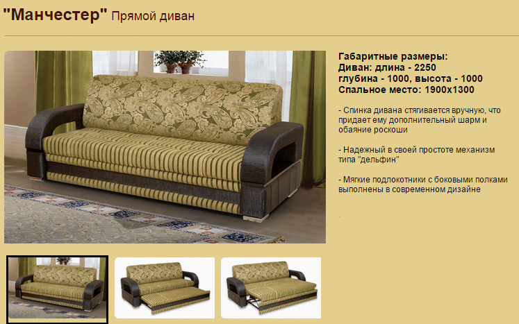 Dieses Modell sieht luxuriös und beeindruckend aus. Es kann leicht die ganze Familie oder eine große Firma passen. Bequeme Armlehnen, die mit Kunstleder gepolstert sind, erlauben es, sich in einer liegenden Position auf sie zu stützen.Das Sofa hat einen klappbaren Delfinmechanismus und einen festen Rahmen aus Naturholz.