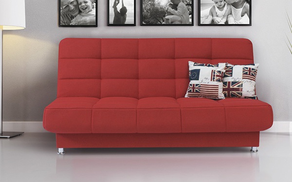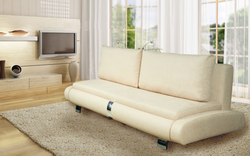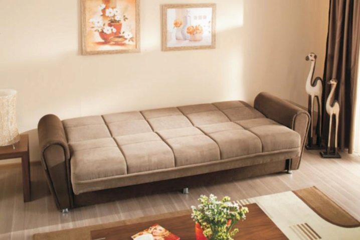 Um ein solches Sofa auszubreiten, müssen Sie das Bett ausrollen und sich zusammendrücken, um das Kissen anzuheben. Dies ist eine gute Lösung für kleine Räume. Ein weiteres Plus: einfache Bedienung.