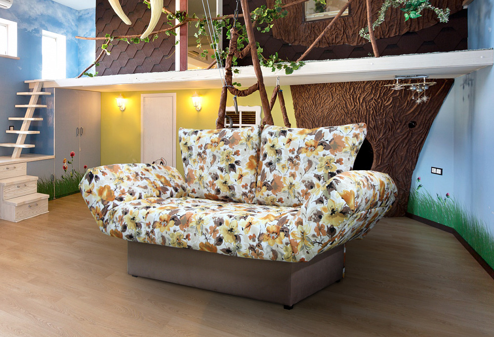 Sofas mit einem Bild für Wohnzimmer oder Kinderzimmer geeignet. Helle Farben und kräftige Zeichnungen unterstreichen den Stil des Raumes und schaffen eine fröhliche, energetische Atmosphäre. Wichtig ist, dass nicht nur die Farbe, sondern auch die Struktur der Polsterung organisch im Innenraum wirkt. Sie können Zubehörteile aufheben, die das Sofa "schlagen", zum Beispiel Vorhänge oder Vasen.Kissen können ein zusätzlicher Raum für Kreativität sein.