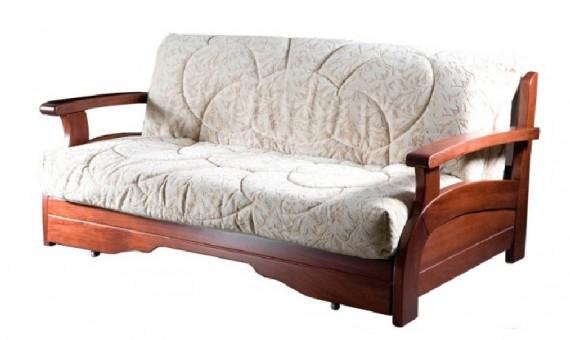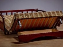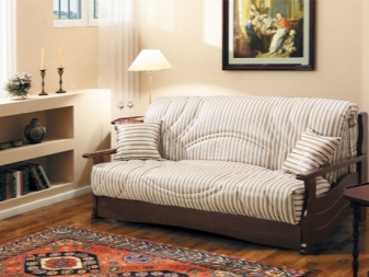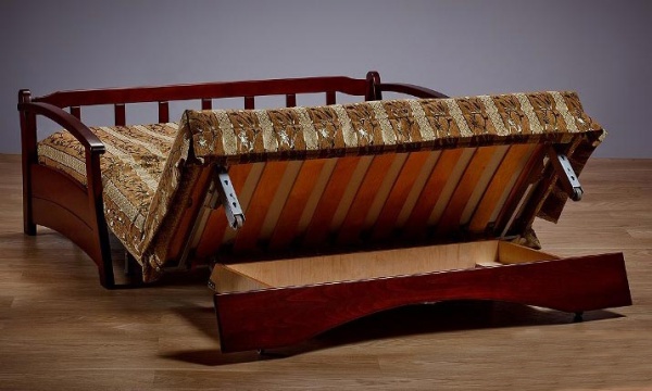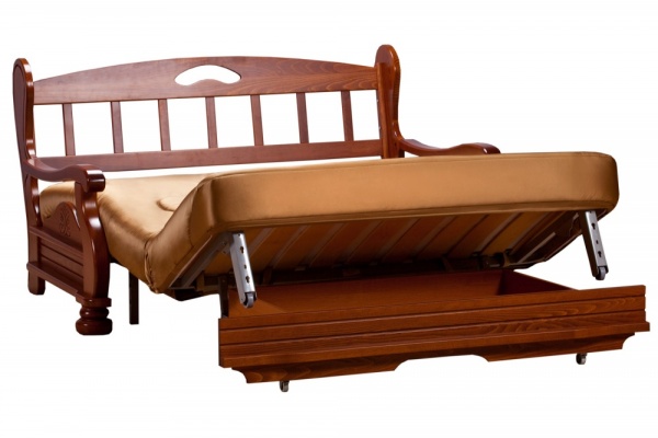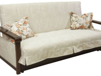 Das ähnliche Sofa mit hölzernen Armlehnen ist ziemlich Haushaltsmodell. Aus dem Titel geht hervor, dass der Mechanismus seiner Entfaltung der Eröffnung des Buches ähnelt. Und das ist tatsächlich so. Ein ähnliches Modell zu zerlegen ist ziemlich einfach. Sie sollten nur den Sitz erheben. Klicke nach dem Klicken sanft zurück. Dank solcher Manipulationen wird der Rücken sinken. Das ist bereit für ein breites Bett, wo Sie schlafen können.