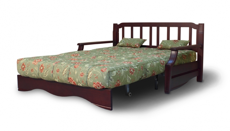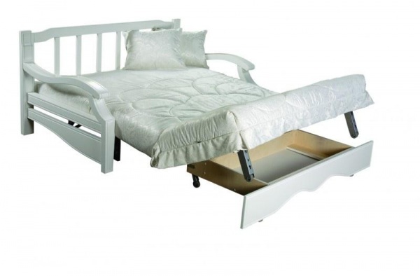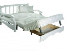 Solche Modelle mit Armlehnen aus Holz werden bequem in ein komplettes Bett umgewandelt. Es ist bequem, solche Möbel zum Beispiel in die Halle zu stellen. Wenn Gäste kommen, werden Sie dort sein, wo Sie sie hinstellen. Komfort und Bequemlichkeit - Merkmale des Modells.