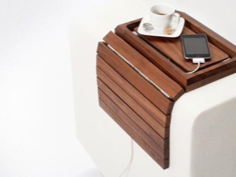 Diese Option besteht aus einer soliden Arbeitsplatte sowie zwei Taschen. Auf eine harte Holzoberfläche können Sie eine Tasse mit Ihrem Lieblingsgetränk, Telefon und andere Gegenstände legen. In den Taschen wird es möglich sein, verschiedene notwendige Dinge zu passen.