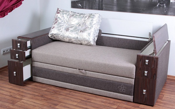 Es sollte beachtet werden, dass dieses Modell viele Design-Lösungen hat. Dementsprechend werden ihre Kosten höher sein. Die Vorteile von "Eurobook" liegen darin begründet, dass es sehr kompakt ist. Ein kleines Sofa kann direkt an die Wand gestellt werden. Funktionelle Armlehnen aus Holz können als Tisch oder Nische zum Aufbewahren von Gegenständen dienen. Das stilvolle Aussehen des Modells wird immer das Auge erfreuen.