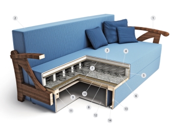 Neben der Polsterung, bei der Herstellung von Sofas mit dem Mechanismus "Akkordeon" verwenden Sie einen anderen Blockfüller. Es kann von zwei Arten sein: Frühling und Springless. Einfach gesagt, der Füller ist ein Material, das die Matten des Sitzes, der Rückenlehne und der Armlehnen ausfüllt. Darüber hinaus wird es in einigen Designs verwendet, die zusätzlich zu der Rückseite zusätzliche Kissen haben.