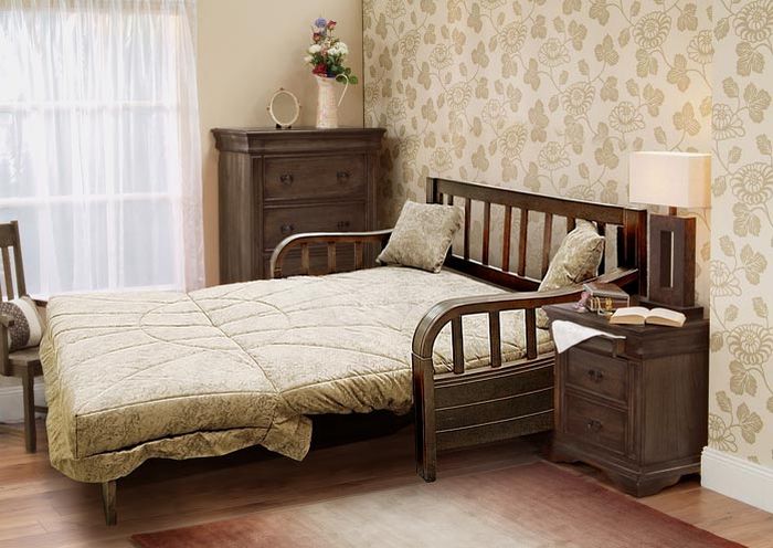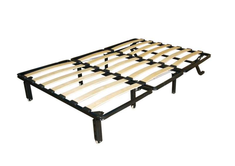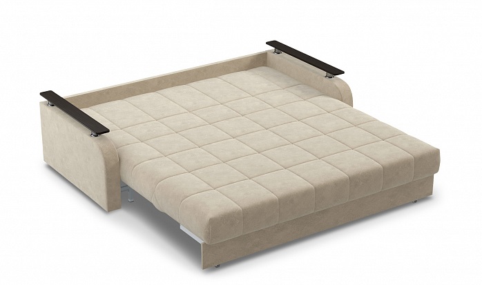Ins Bett zu gehen bedeutet, die Komponenten auseinander zu bewegen: Ein Teil bewegt sich vorwärts, während die anderen beiden nach unten gehen. Im zusammengeklappten Zustand nimmt dieses Modell nicht viel Platz ein und passt somit in fast jeden Raum.