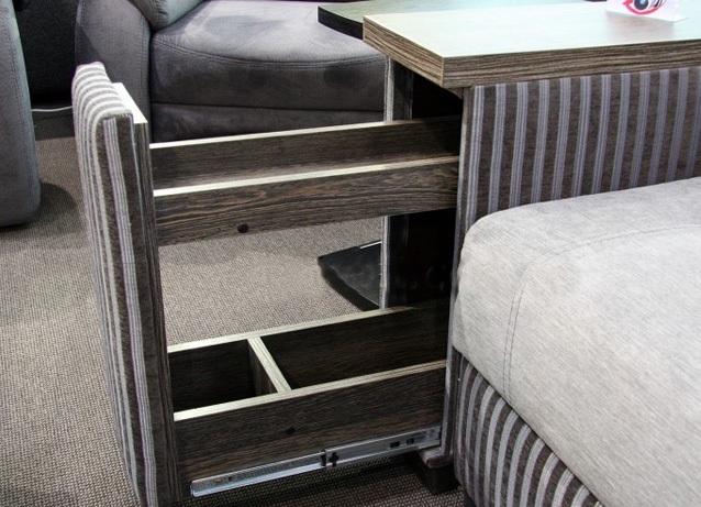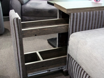 Mit Nischen in den Armlehnen. Diese Option ist sehr interessant und praktisch. Armlehnen haben spezielle Nischen, wo Sie eine Vielzahl von Dingen und Gegenständen platzieren können. Dies wird Ihnen helfen, Platz zu sparen.