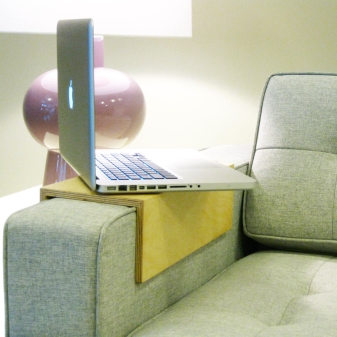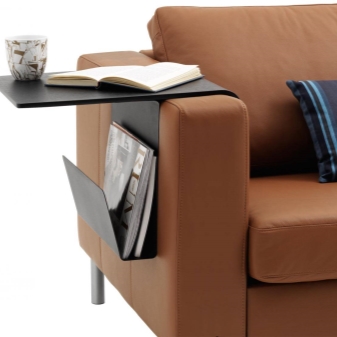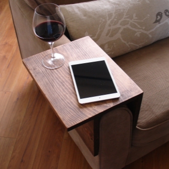 Sie können ein spezielles Tablett an der Armlehne kaufen, mit dem Sie bequem auf der Couch sitzen und sich nach einem ertragreichen Tag entspannen können. In der Nähe können Sie einen Teller mit Snacks und einer Tasse Kaffee legen. Ein Ständer auf der Armlehne ermöglicht Ihnen einen einfachen Zugang zu nicht nur Essen, sondern auch zum Beispiel Bücher, ein Laptop, ein Tablet. Dort können Sie das Telefon aufstellen. Dieses Design kann aus verschiedenen Materialien bestehen.: