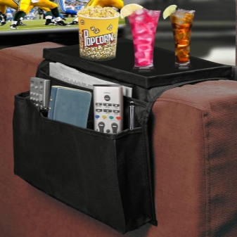 Varianten mit Taschen. Typischerweise haben diese Untersetzer eine stabile Tischplatte und weiche Taschen. Dort können Sie die Fernbedienung, Bücher, Telefone und andere Gegenstände, die Ihnen wichtig sind, zusammenklappen.