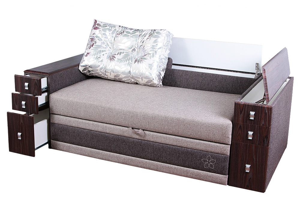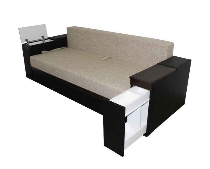 Mit zu öffnenden Armlehnen. Diese Option ist sehr praktisch. Sie können die kreativsten Modelle kaufen. In diesem Fall wird das Produkt kompakt aussehen. Und in der Armlehne können Sie eine Vielzahl notwendiger Dinge finden.