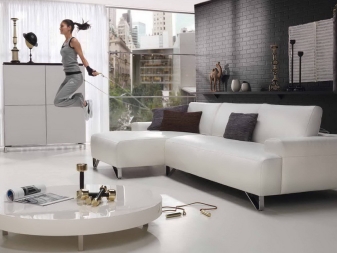 - Für den Fall, dass Sie das Wohnzimmer einrichten Nach den Prinzipien von High-Tech ist Weiß oder jede helle Säure am besten geeignet.