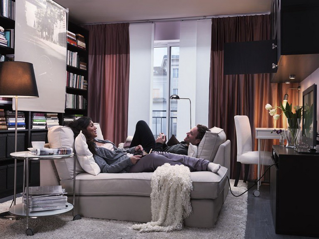 - Einziehbare Couch Es wurde zur einfachsten und verständlichsten Lösung des Problems. Bei diesem Mechanismus wird der Hauptliegeplatz einfach etwas nach vorne herausgezogen, und die Rückseite, deren Rückseite so weich ist wie die Couch selbst, geht auf den leeren Teil des Rahmens hinunter. Als Ergebnis erhalten Sie fast ein komplettes Analog von eineinhalb oder Doppel-Sofa;