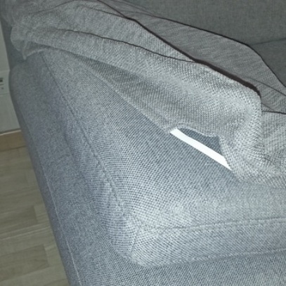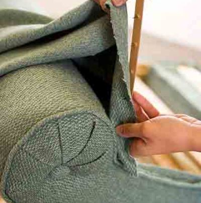 - Um die Falte zwischen dem Sitz und der Rückenlehne des Sofas nicht zu vergessen und das Muster zu fixieren, können Sie einen Staubsaugerschlauch oder einen Wischmopp verwenden. Wir dürfen die Falte nicht vergessen, die in das Sofa gesteckt wird, weil es bei der Landung notwendig sein wird.