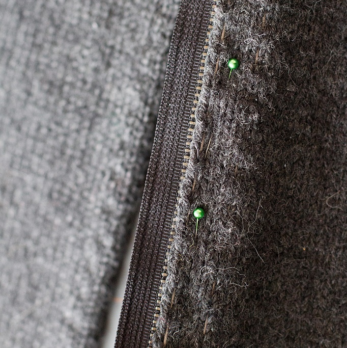 Wenn während der Montage der Deckel auftauchte, können Sie die Nähte abschleifen. Alle Kanten glatt biegen, fegen und dann auf eine Schreibmaschine sticken. Jede Naht ist besser von innen mit Vlies zu handhaben, so dass es klar und eben ist. Das direkte Nähen ist keine langwierige Prozedur (dauert etwa eine Stunde), ist aber schwierig, weil das Gewebe voluminös und dicht ist, so dass es sich schwer unter der Nadel bewegt.