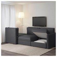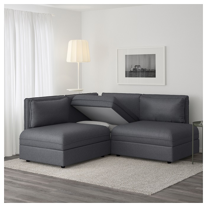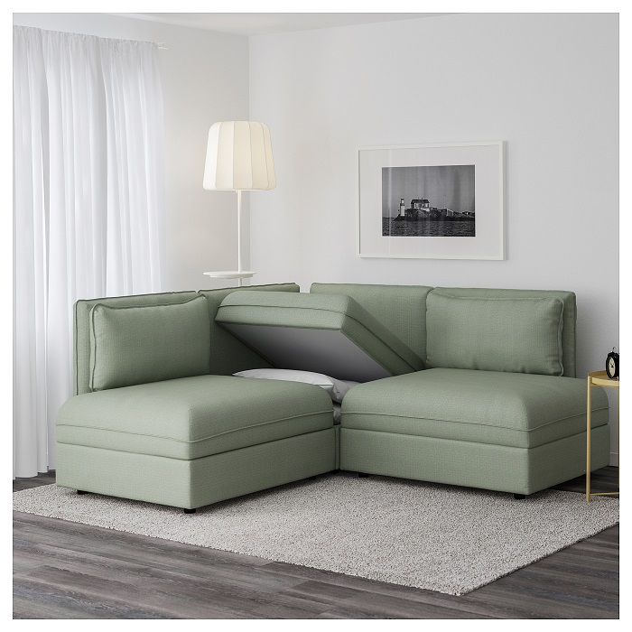Ecksofa "Vallentuna" kostet ein wenig mehr als die vorherige Version. Die Kosten für solche Möbel sind etwas über 75 Tausend Rubel. Breite - 193 Zentimeter, Tiefe - 193 Zentimeter, Höhe - 84 Zentimeter. Für das Wohnzimmer können Sie ein Modell von grün oder dunkelgrau wählen. Dieses Modell kombiniert ein geräumiges Sofa und einen großen internen Stauraum.