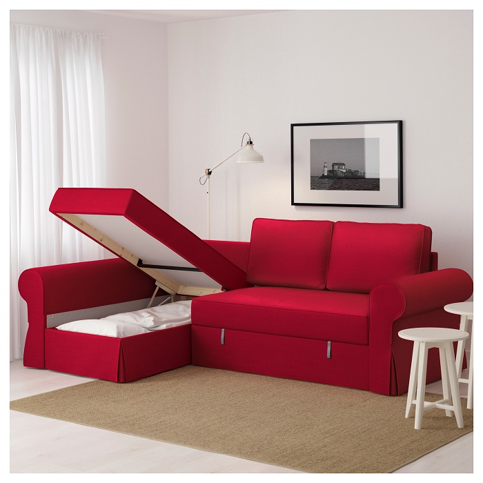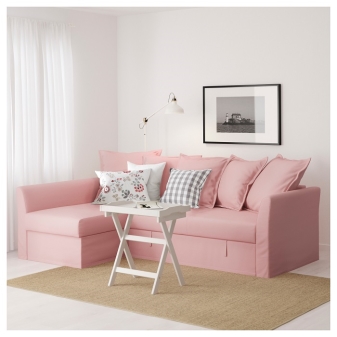 Das Ikea Ecksofa bietet viel Platz zum Entspannen, aber es wird nicht viel Platz im Raum einnehmen, da dieses Modell bequem an die Wand gestellt werden kann. Ikea Sofa "Holmsund»Erweiterbar - und Sie erhalten ein geräumiges Doppelbett. Die Kosten solcher Polstermöbel überschreiten 36 Tausend Rubel nicht. Die Polsterung ist ein strapazierfähiges, strapazierfähiges Baumwollgehäuse in hellen Pinkfarben. In der Chaiselongue - einem Eckplatz - befindet sich eine Box zum Aufbewahren von Schlafkleidung und verschiedenen Haushaltsgegenständen.