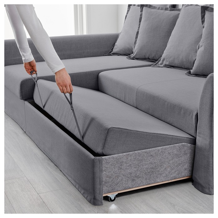 Die Oberfläche der Sofapolsterung ist glatt, das Material ist von hoher Qualität und langlebig. Alle Kissen sind abnehmbar, sie können so platziert werden, dass sie die Tiefe des Sitzes einstellen und eine bequeme Position für den Rücken einnehmen. Um das Holmsund-Sofa in einen Schlafplatz zu verwandeln, müssen Sie den Rücken entfernen und den Sitz herausziehen, indem Sie die verfügbaren bequemen Gurte ziehen.