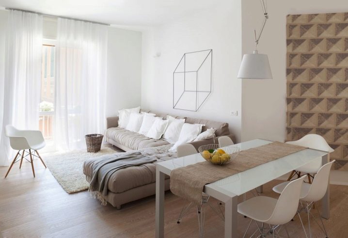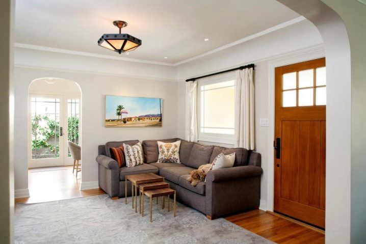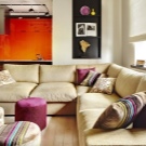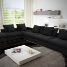 Auch viele Käufer wählen ein Ecksofa als Eine gute Möglichkeit, den Raum einzuteilen, wenn Sie ein Design-Studio-Apartment erstellen. Es verleiht dem Raum Offenheit und macht es optisch größer. Zur gleichen Zeit sind sowohl traditionelle L-förmige Sofas als auch Retro-Modelle beliebt. In kleinen Räumen können die Eckkonstruktionen entweder nahe an der Wand positioniert werden, oder Sie können etwas Platz hinter der Seitenlehne lassen.