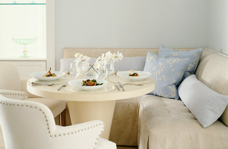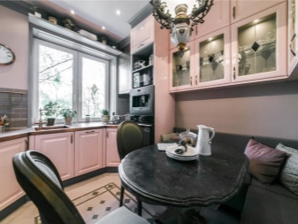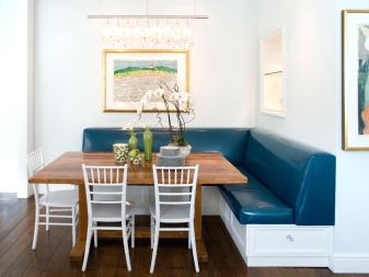 Sie können ein kleines Ecksofa in die Küche oder auf den Flur stellen. Wenn in der Küche nicht genügend Platz für einen großen oder breiten Essbereich ist, ist ein L-förmiges Ecksofa eine gute Wahl. Wenn man es in der Nähe einer Mauer mit zwei Fenstern installiert hat, haben die Bewohner die Möglichkeit, eine schöne Aussicht zu genießen, und im Sommer, wenn das Fenster offen ist, werden sie sich wie in einem Pavillon im Freien fühlen. Die zarte Pastellfarbe dieser Möbel verleiht dem gesamten Innenraum Leichtigkeit und harmoniert mit den helleren Wänden und den Böden aus natürlichem Holz. Ein kleiner Esstisch oder Couchtisch wird im Inneren funktional und logisch sein.