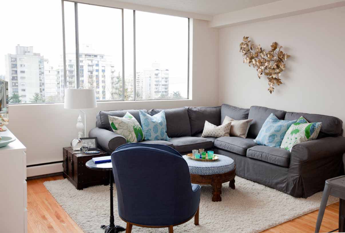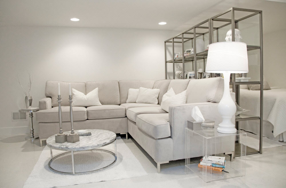Es gibt auch Möglichkeiten, mit Hilfe eines eckigen Sofas verschiedene Möglichkeiten für die Zoneneinteilung zu schaffen. Sie können eine Ecke mit einem L-förmigen Sofa arrangieren, das auf der einen Seite an der Wand und das andere auf der anderen Seite des Raumes platziert ist, wodurch ein Gästebereich entsteht.Dies ist eine gute Lösung für Wohnungen ohne Eingangshalle und die Eingangstür öffnet sich direkt ins Wohnzimmer. Eingehende Gäste passieren in diesem Fall einen imaginären Korridor hinter der Sofalehne und umgehen ihn um den Gästebereich zu betreten.
