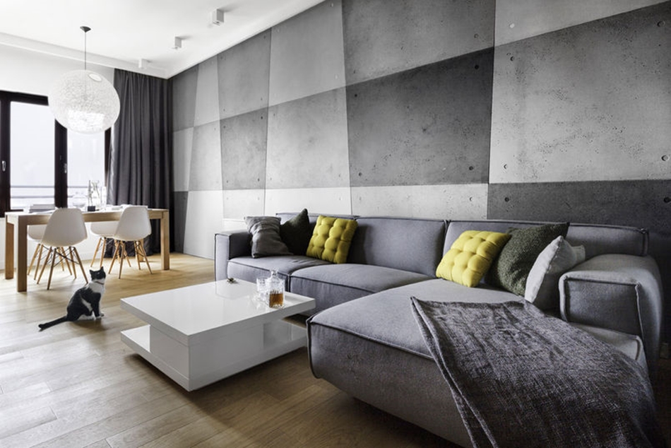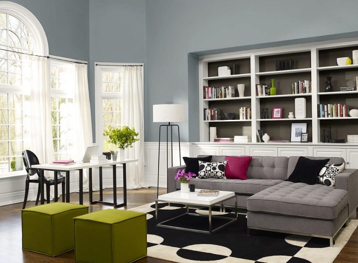 Mit Hilfe eines eckigen Ecksofa sieht das Wohnzimmer geräumig aus, auch wenn der Raum sehr begrenzt ist. Das Sofa hat eine praktische Schieferfarbe, wirkt aber aufgrund der abgerundeten Armlehnen und weichen Linien der Kissen und des Sitzes nicht sperrig. Der weiße Teppich auf dem Boden schafft die Illusion von Raum, und da sich das Sofa in der Ecke befindet, ist im Raum genügend Platz für einen weichen Stuhl oder einen gepolsterten Hocker. Der Miniaturtisch in der Mitte des Raumes und eine Stehlampe in der Nähe der Armlehne, die abends das sanfte Zwielicht erhellt, werden zu einer organischen Ergänzung der Komposition.