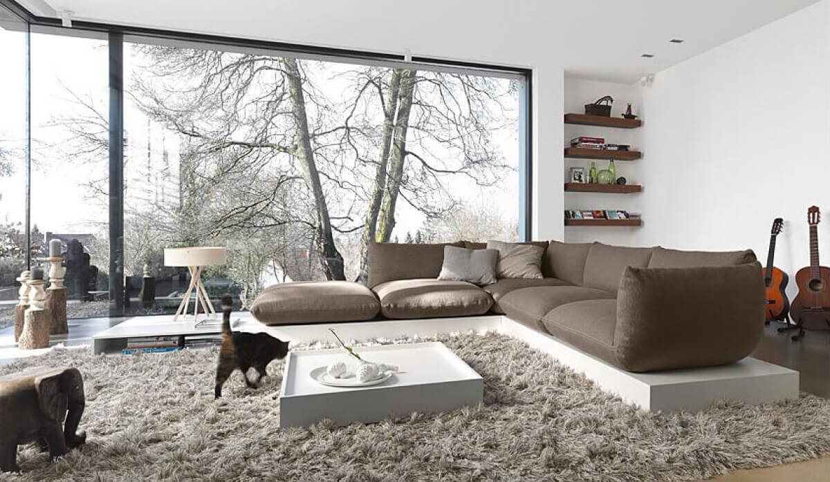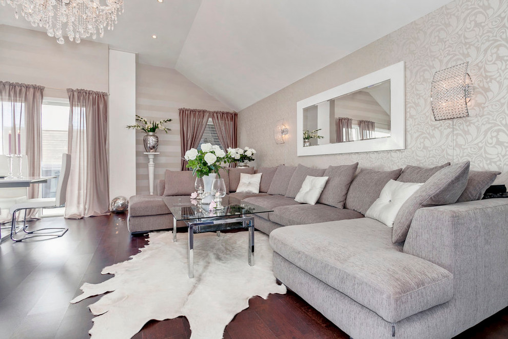Sie können ein eckiges Sofa sowohl in einem großen als auch in einem kleinen Wohnzimmer installieren, die Hauptsache ist, die richtige Größe und Konfiguration zu wählen. Für sehr geräumige Wohnzimmer kann das Ecksofa mit einem Doppel-oder Dreifach-Sofa, Sessel, Ottomanen und einem Tisch ergänzt werden. Ein harmonisch eckiges Sofa wird mit einer großen vertikalen Pflanze in einem Topf hinter dem Rücken oder in der Dämmerung mit versteckter Beleuchtung kombiniert.