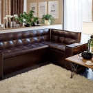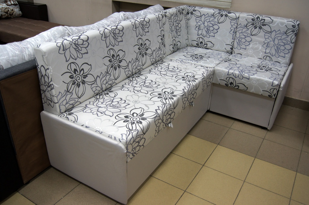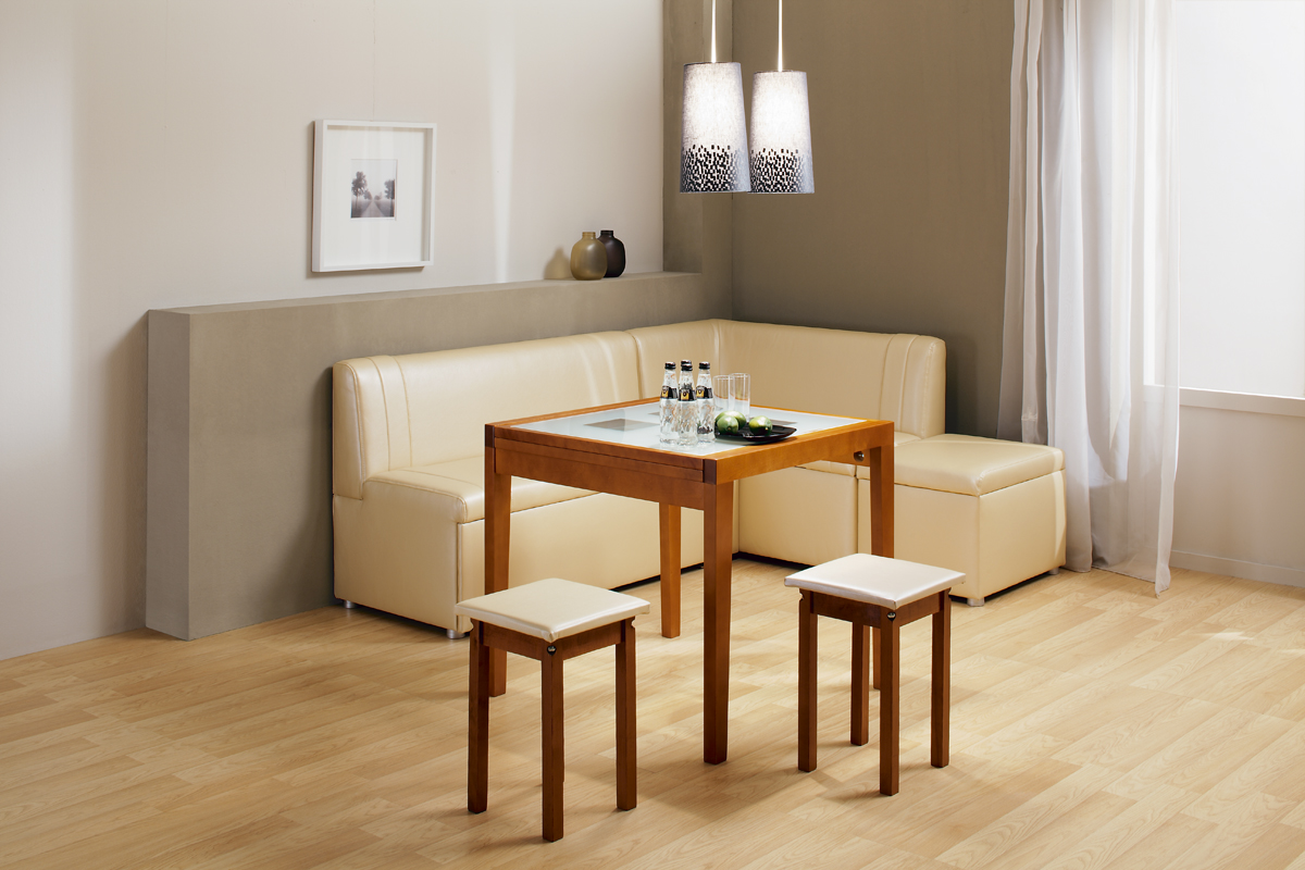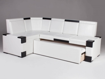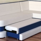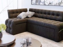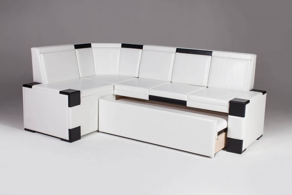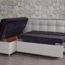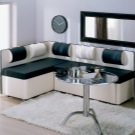 Dies ist eine weiche Küchenecke mit einem Schlafplatz, der einem halben Bett entspricht. Eckige Ausführung und rechts und links. Sie können ein Sofa in eine feste Struktur gegen jede Wand in der Küche zusammenbauen. An der Kreuzung der Möbelmodule steht ein Regal für Dinge. Es passt perfekt zum Kochbuch, Festnetztelefon, Servietten und allen kleinen Dingen, die Sie benötigen.