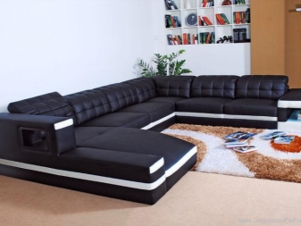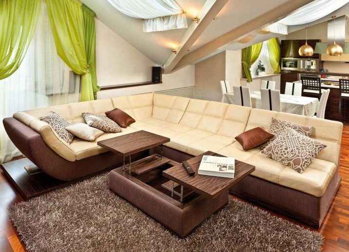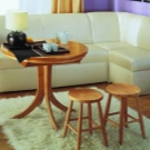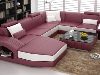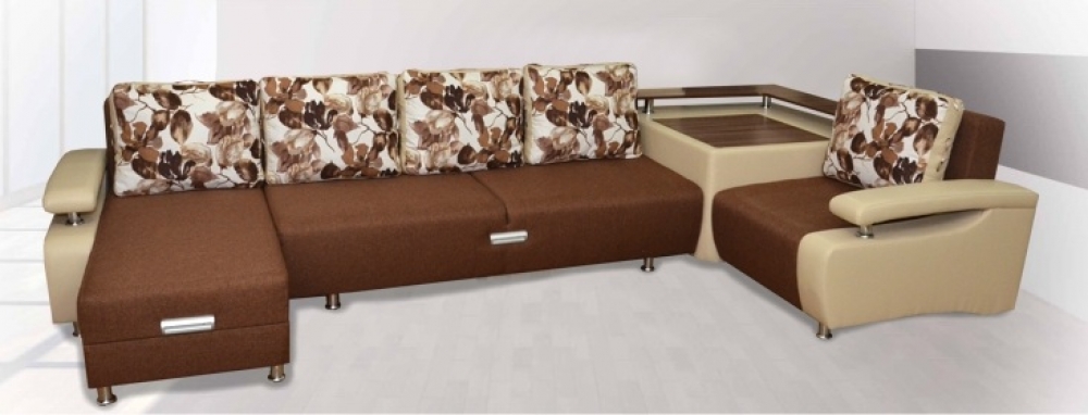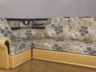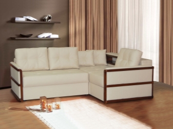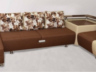 Eine Besonderheit von Sofas für ein Wohnzimmer, in denen Teetrinken mit Gästen nicht selten ist, sind Modelle mit einem Tisch. In der Regel befindet es sich neben der Armlehne, es kann sich vorwärts bewegen und zurückziehen. Als Material für die Herstellung des Tisches werden Spanplatten, MDF, Holz, Sperrholz verwendet.