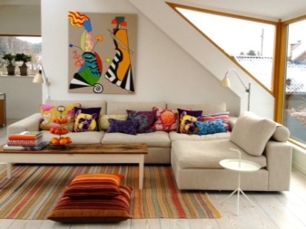 - Monochrome Sofas mit einer Vielzahl von bunten Kissen sehen im Innenraum wie ein helleres Element aus. Sie können groß und klein, groß und gedrungen, flach, geblasen, rund, lang, in Form von Rollen sein. Das Bild passt zu jedem. Die Kombination von Farben - die vielfältigsten.Die Hauptsache ist, dass sie miteinander und mit der Hauptfarbe der Möbel harmonieren.
