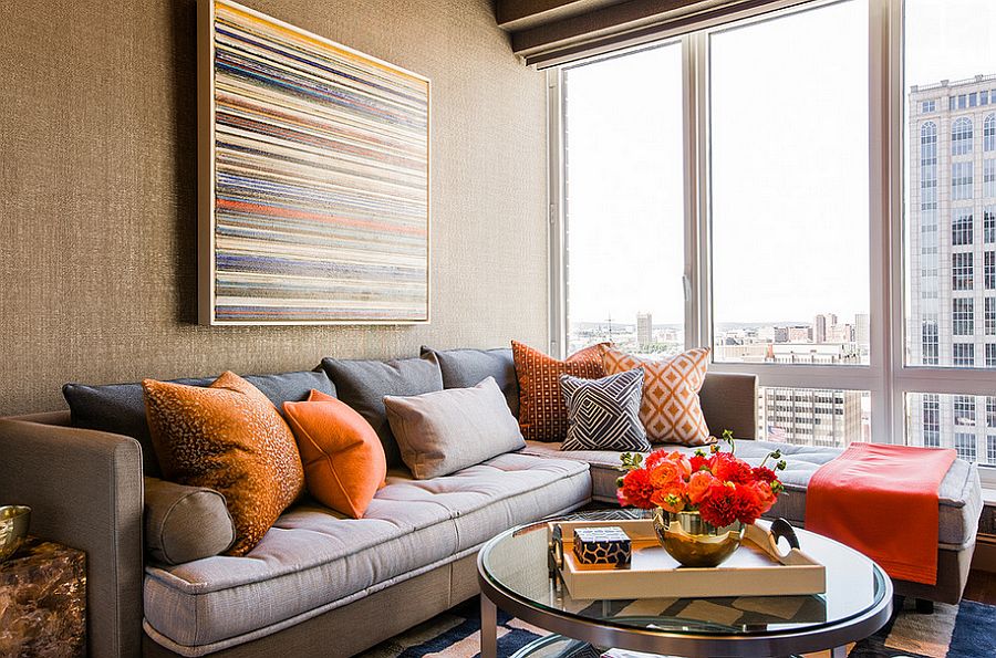 - Als Alternative zur Monotonie der Sofas wirken in der sogenannten zweifarbig Es kann eine Kombination aus kontrastierenden Farben und einem hellen Muster auf einem dunklen Hintergrund in der gleichen Farbpalette und Accessoires sein, die in der Farbe unterschiedlich sind.