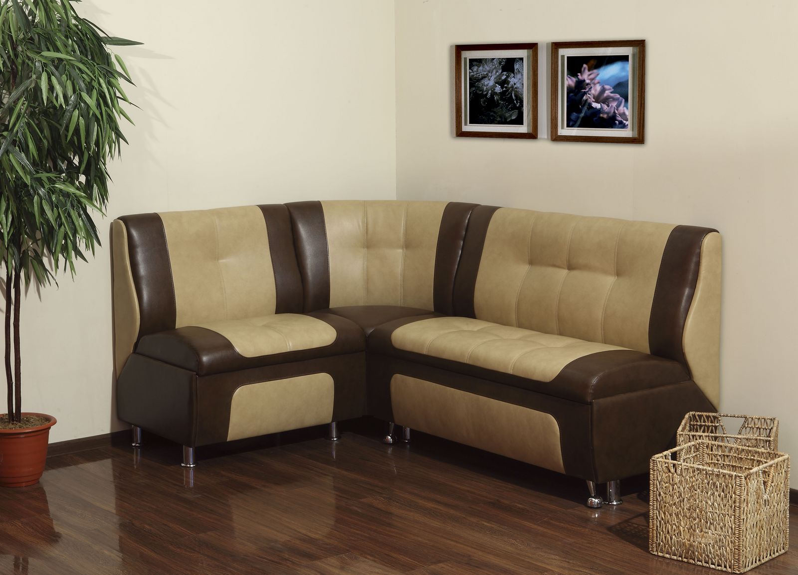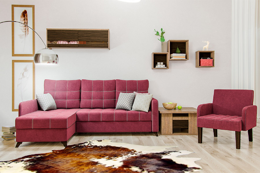 "Mittel" bedeutet ein kleines kompaktes Ecksofa, das aufgrund seiner Vielseitigkeit den ästhetischen und praktischen Bedürfnissen seiner Besitzer gerecht wird. Wenn es zusammengebaut wird, sieht es ordentlich aus, nimmt nicht viel Platz im Raum ein und bewegt sich leicht von einem Raum zum anderen.