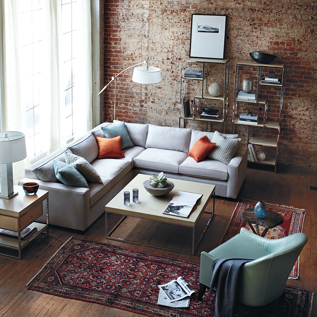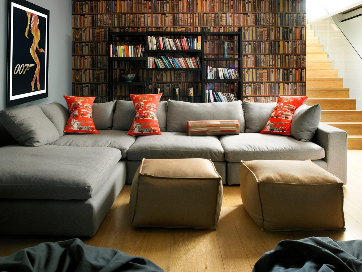Atmosphärische Jugendlounge, deren Basis ein helles, modulares Sofa ist.