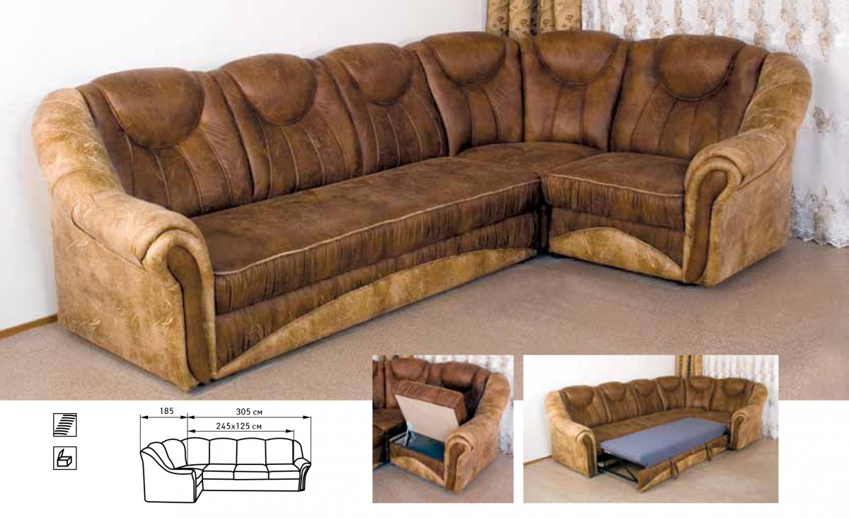 Im zusammengeklappten Zustand beträgt die Kapazität 4-5 Personen und die Bettbreite von 152 cm ist für zwei Erwachsene ausgelegt. Transformationsmechanismus - "eurobook". Die Grundlage des Bettes bildet eine orthopädische Federeinheit.