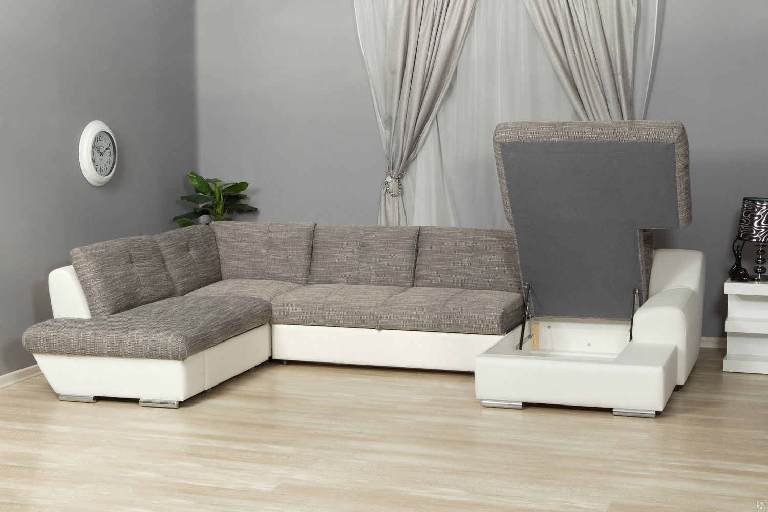 Die Ecke des Sofas ist mit einer Schublade für Bettwäsche ausgestattet. Das Modell ist mit Kissen mit abnehmbaren Bezügen ausgestattet.