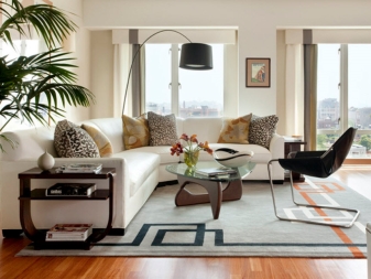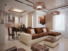 Polstermaterialien müssen sicher und umweltfreundlich sein. Es ist besser, natürliches Holz, Metall, Leder zu kaufen. Wählen Sie ein Sofa mit Federn an der Basis, die von hoher Festigkeit sind, und der Rahmen war Holz.Wenn das Wohnzimmer mit einer Küche kombiniert wird, ist es praktischer, Polstermöbel zu kaufen, die abnehmbare Abdeckungen haben. Sie können jederzeit gereinigt und gewaschen werden. Wenn man zwischen der Standard-L-förmigen Form und anderen Strukturen (beispielsweise oval und U-förmig) wählt, ist es besser, die erste zu bevorzugen, da die anderen Formen mehr Platz einnehmen. Wenn der Raum klein ist, werden solche Konstruktionen kostbare Quadratmeter "essen".