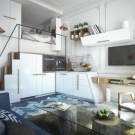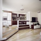 - Verwenden Sie bei der Endbearbeitung die Methode zum Wechseln der Bodenarten. Der Boden ist so gestaltet, dass die Fliesen in der Küchenzone das Parkett des Wohnraumes ersetzen, als ob sie sich voneinander trennen würden.