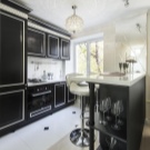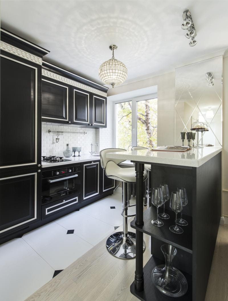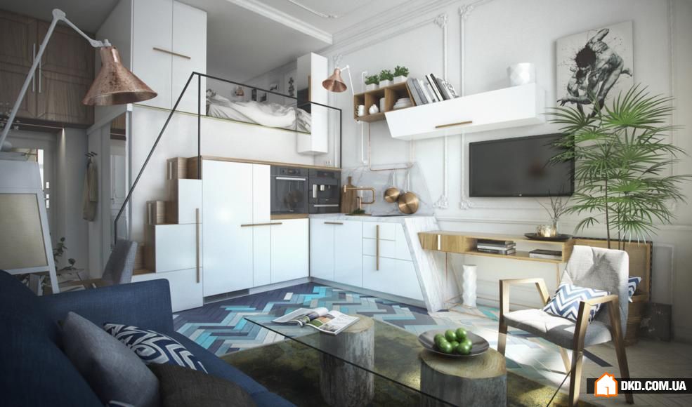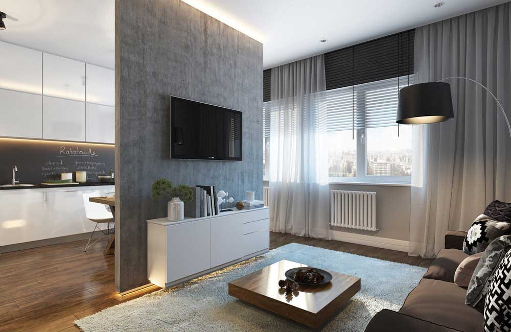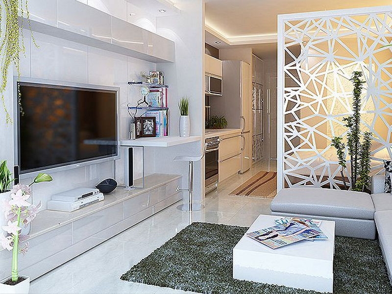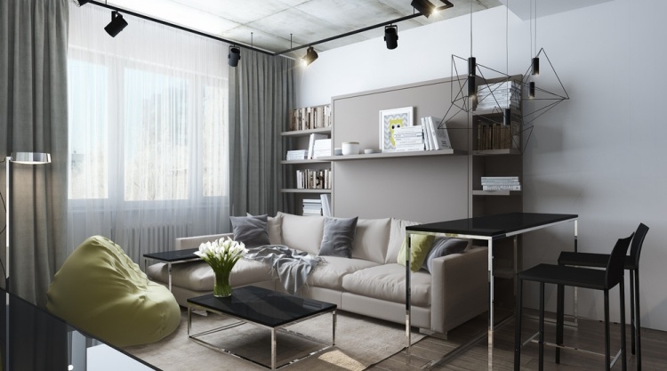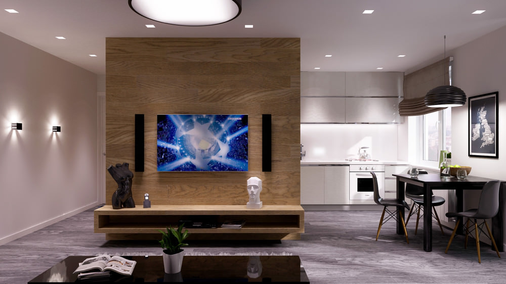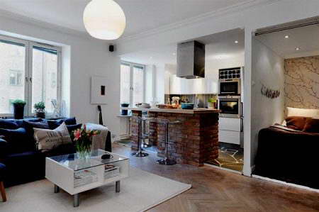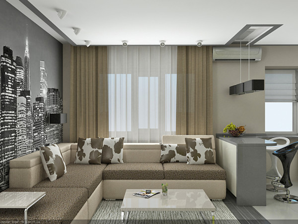 Danach sollten Sie entscheiden, wie es einfacher ist, den Bereich zu begrenzen.In der Studio-Wohnung sollte die Küche reibungslos ins Wohnzimmer verlegt werden, und die Gestaltung aller Zonen sollte solide und harmonisch sein, scharfe Übergänge im Innenraum sind nicht erlaubt. Das Wohnzimmer und die Küche liegen oft nebeneinander und werden von einem modernen Bartresen geteilt.. Es ist perfekt für Familienessen und zum Abendessen mit Freunden und perfekt mit der Funktion der Zonierung fertig.