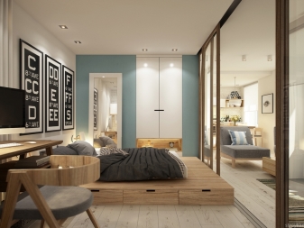 Ein Schlafplatz rüste Lichtvorhang aus. Es sieht elegant aus, ähnelt einem Baldachin, schützt aber gleichzeitig das Bett vor neugierigen Blicken.Der Schlafbereich sollte so weit wie möglich vom Eingang des Zimmers entfernt sein. Trennen Sie den Schlafbereich und nutzen Sie das Podium. Ein weiterer Vorteil dieser Lösung ist die Möglichkeit, Boxen auf dem Podium zu befestigen, in denen Bettwäsche und anderes Zubehör bequem verstaut werden kann.