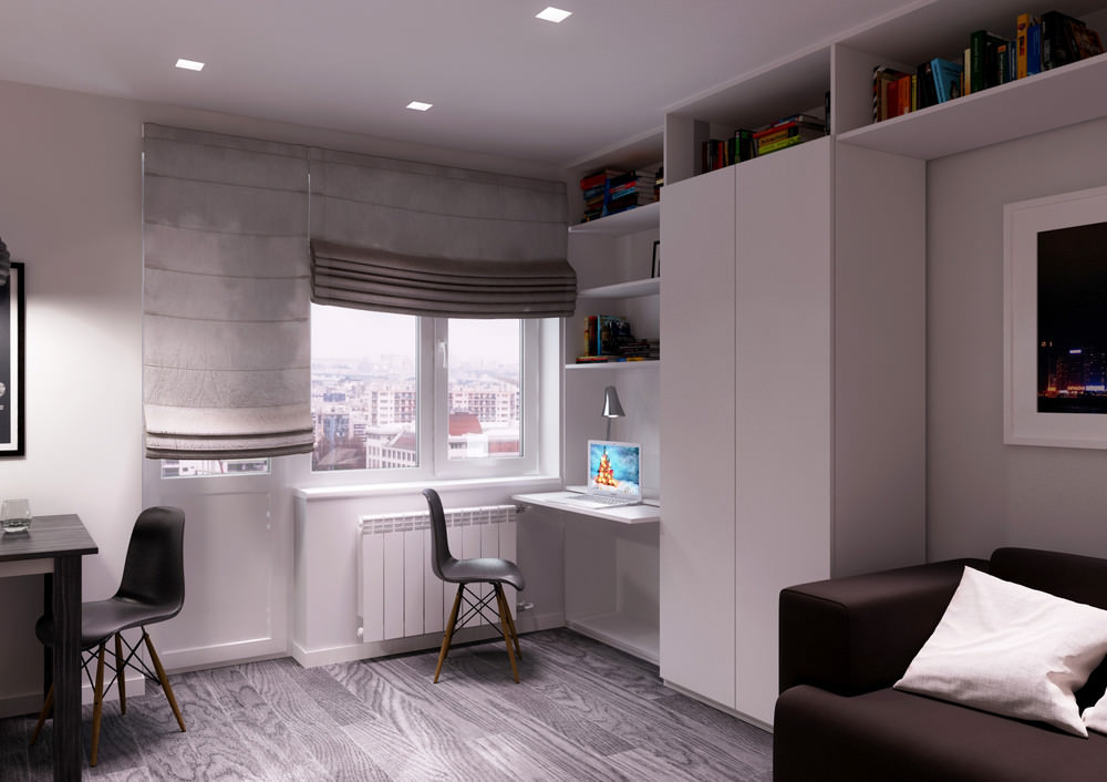 In modernen Wohnungen von 30 Quadratmetern. Es ist wichtig, das Vorhandensein eines Balkons zu berücksichtigen.So ist es besser, die Loggia zu wärmen, damit Sie dort ein praktisches Aufbewahrungssystem platzieren können, zum Beispiel einen Schrank mit geschlossenen Regalen. Dieses Design wurde gewählt, um das Innere zu "entladen". Auf dem Balkon tragen oft ein Naherholungsgebiet, dort Platz und ein Kaffeetisch.