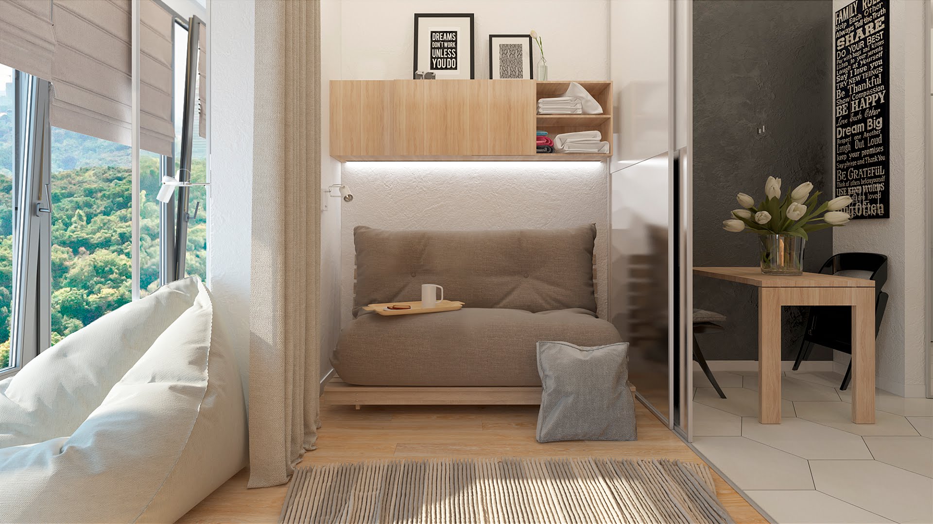 Von großen dekorativen Gegenständen sollte aufgegeben werden. Wird perfekt mit der Zonierung von hohen und flachen Aquarien zurechtkommen. Es braucht nicht viel Platz, aber es wird den Schlafbereich perfekt verbergen. Wenn Sie sich für die Innenarchitektur eines Studios entscheiden, sollten Sie einige Nuancen beachten: