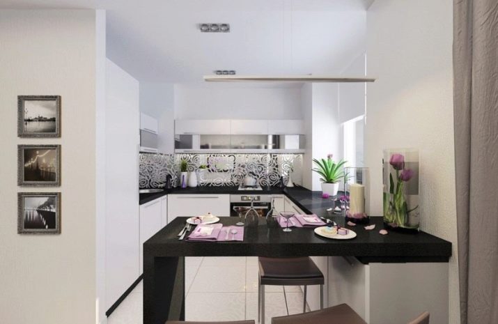 Küchendesign sollte eine Atmosphäre der Fülle von Licht und Raum schaffen. Es ist besser, alle Möbel an einer Wand und auf der gegenüberliegenden Seite einen Essbereich anzuordnen. So wird das Design moderner und modischer und der Raum - funktioneller. Wenn Sie das Zimmer in einem minimalistischen Stil einrichten, können Sie dort nur die wichtigsten Küchenelemente, komplett vom Esstisch befreit, platzieren.Seine Rolle kann durch eine verlängerte Schwelle oder einen schmalen und funktionellen Balkenzähler erfüllt werden.