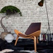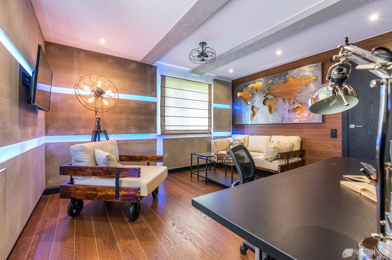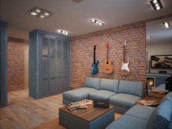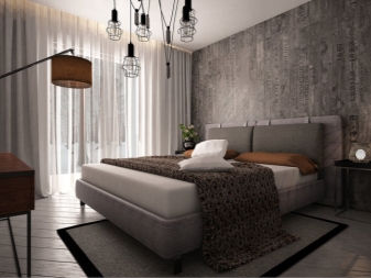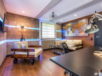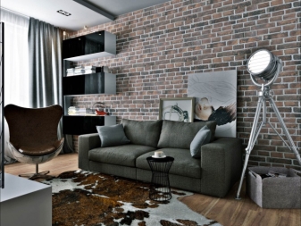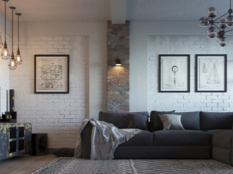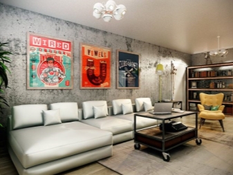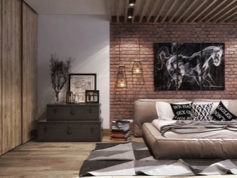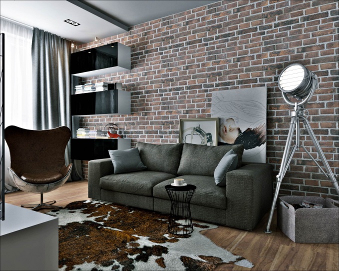 Stilvoll sind in einem solchen Innenraum Lampen, deren Design dem Design einer Mining-Taschenlampe ähnelt. Auch als Hintergrundbeleuchtung im Innenraum des Raumes im Loftstil sollten Sie Diodenlampen verwenden. Bei der Wahl der Möbelpolsterung Bevorzugen Sie Modelle mit einem Zeitungsdruck oder ungewöhnlichen Inschriften. Fotos und Gemälde sollten schwarz und weiß und vintage sein. Auf dem Boden oder an der Wand können Sie natürliches oder künstliches Fell als Alternative zu großen farbigen Teppichen arrangieren.