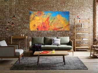 Um die Küche zu beenden, können Sie Stillleben verwenden. Im Wohnzimmer ist die Wand mit hellen Graffiti, abstrakten Drucken zu dekorieren. Bilder können chaotisch an die Wand gestellt werden, große Kunstwerke können gar nicht aufgehängt werden, sondern nur an die Wände gelehnt.