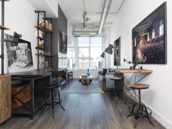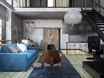Loft Style beinhaltet die Verwendung von ziemlich einfachen Möbeln, die sich durch hohe Funktionalität auszeichnet. Bei der Wahl der Farben bevorzugen sie kalte Töne, was das Hauptmerkmal dieses Stils ist. Dekorative Elemente im Innenraum in diesem Stil sind praktisch nicht vorhanden. In der Regel erweitern sich alle Gänge, alle Grenzen werden gelöscht.