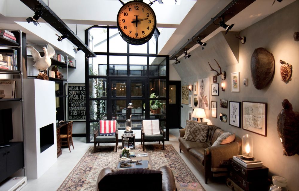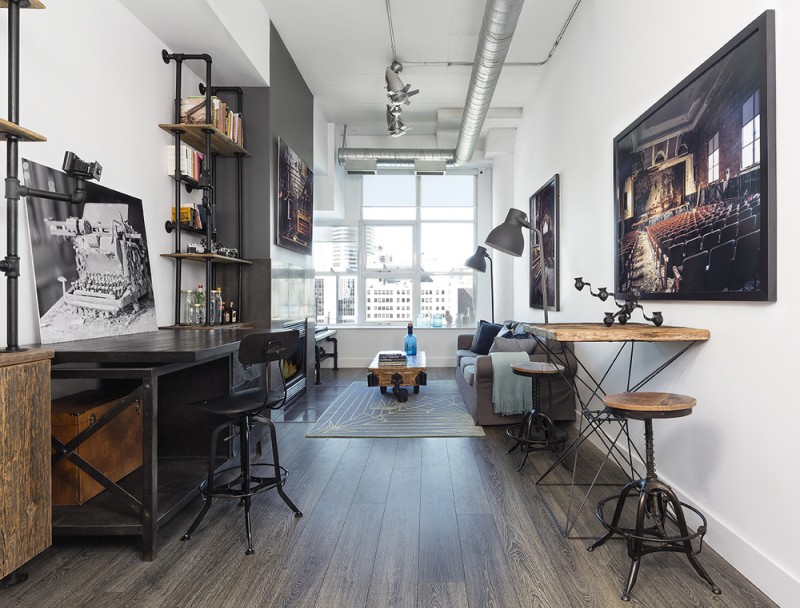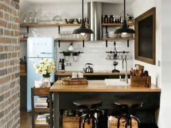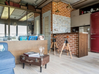 Für den Stil des Lofts zeichnet sich die Verwendung von ungewöhnlichen Lösungen aus. Also, wenn Sie einen Bartresen haben, dann können Sie auf Barhockern die üblichen Sitze durch alte Fahrradsessel ersetzen. Die Rolle einer Kommode passt zu einem alten Koffer.Eine traditionelle traditionelle Vase sollte entfernt und durch Glasflaschen ersetzt werden, die mit Acrylfarbe bemalt werden können. Diese Berührungen im Inneren können ihm Vollständigkeit verleihen.