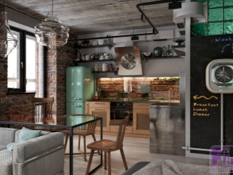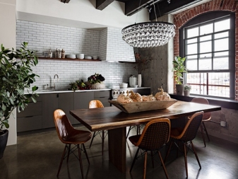 Es ist besser, wenn die Möbel sein werden nicht ganz Standard. Perfekt gealterte und Vintage-Artikel. Versuchen Sie, die Möbel so zu gruppieren, dass die geräumigen Räume im Loftstil in Zonen aufgeteilt werden, so dass es einfacher ist, viele Trennwände zu entfernen. Wenn Sie sich für das klassische Design des Tisches entscheiden, ist es besser, ein Modell mit einer Tischplatte aus Holz und einem Metallgestell zu wählen. Stühle können auch einen Metallrahmen haben. Beliebte Modelle mit verchromten Beinen und Klappstrukturen.