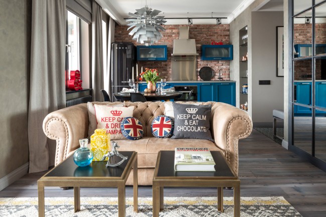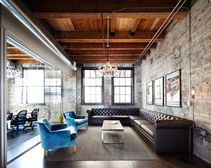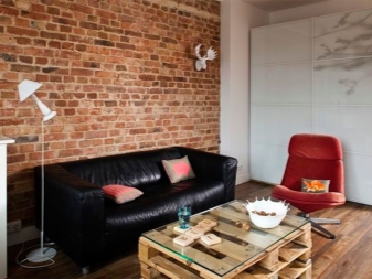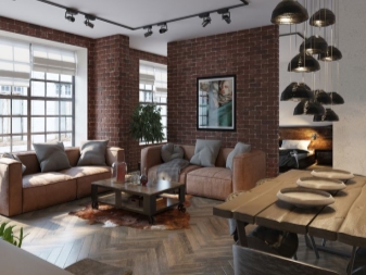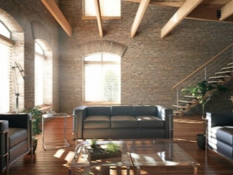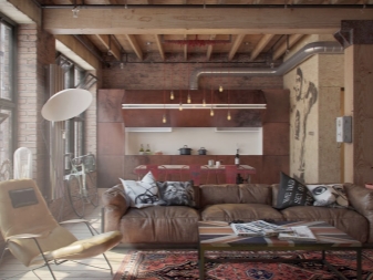 Weichledermöbel in verschiedenen Farben: Rot, Schwarz, Braun passen perfekt in dieses Interieur. Damit das Interieur interessanter aussieht, ist es besser, Vintage-Sofas mit Schrammen zu wählen.