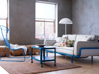 Interessantes Design in grau-blauen Farben. Der Schwerpunkt kann mit einem kleinen roten Sofa oder einem lila Hocker gemacht werden. Bei der Wahl der Farben für das Interieur, bevorzugen Sie nur zwei Grundfarben, andere Möbel sollten in Schattierungen aus den primären ausgewählt werden.