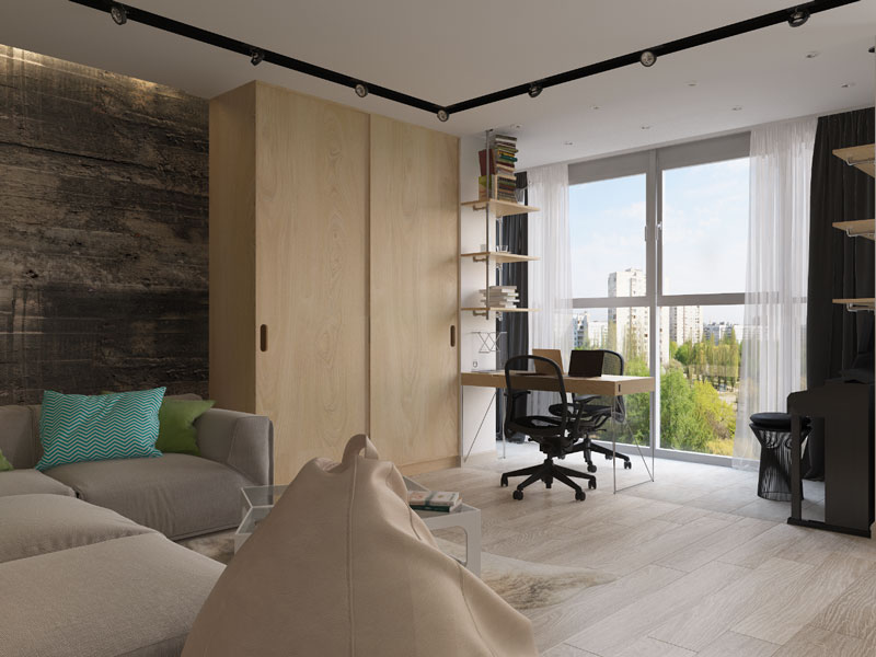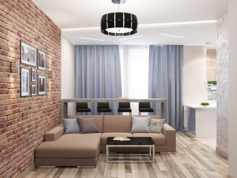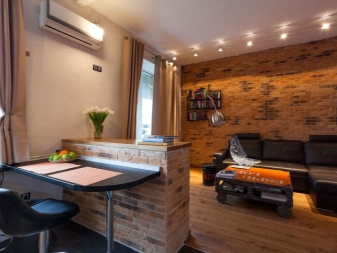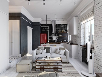 Für eine Wohnung im Loftstil gibt es viel Freiraum. Drinnen sollten keine unnötigen Grenzen sein. Die Inneneinrichtung selbst sollte einfach sein. In diesem Fall erfolgt die Zoneneinteilung in den Studios ohne den Einsatz von Bildschirmen und Schiebetüren, und die Trennung von Texturen, Materialien und Farben wird zur Trennung verwendet.