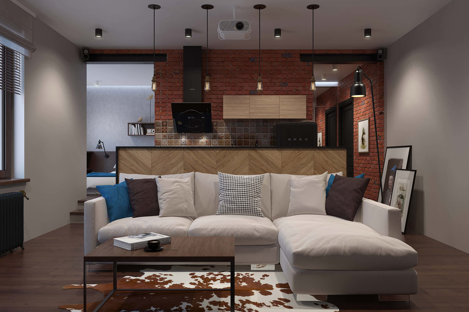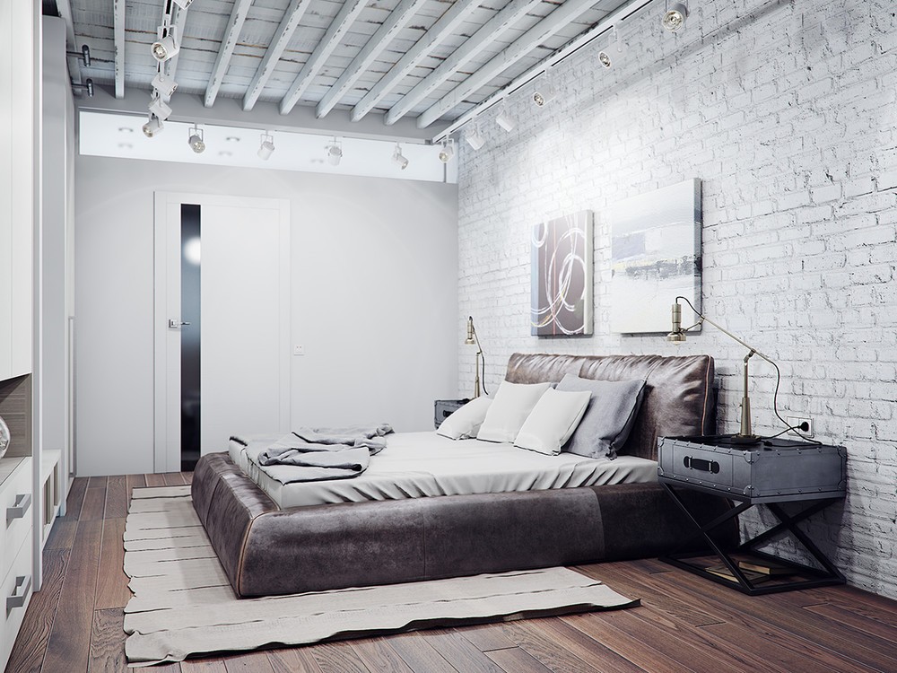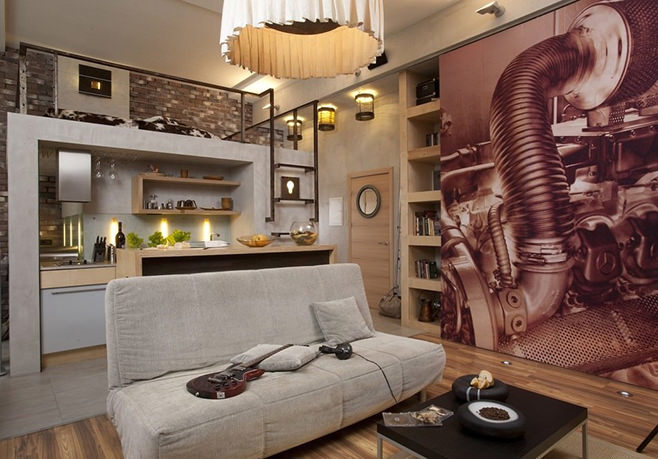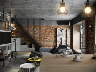 Designer bieten viele interessante und ungewöhnliche Beispiele von Loft-Stil Interieur. Um Akzente zu setzen, können Sie also ein mehrstufiges Licht erzeugen. Farbakzente im Innenraum können Kissen, Bücher mit farbigen Bezügen oder Decken sein.